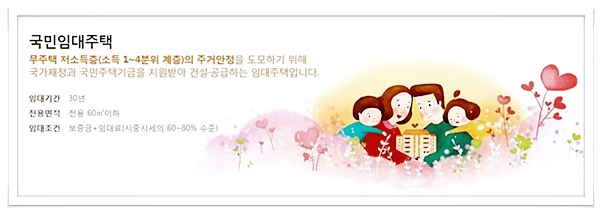 - 국민임대는 무주택 저소득층(소득 1~4분위 계층)의 주거 안정을 위해서 전용면적 60㎡이하로 공급되며, 임대료는 시세의 60-80%수준으로 저렴하다.