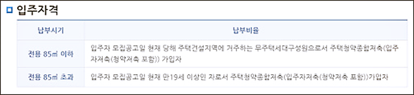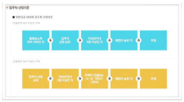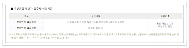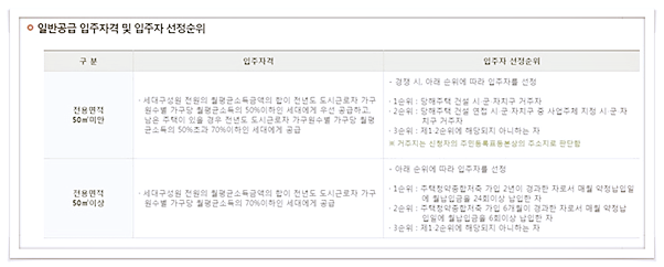 * 주택의 전용면적 50제곱미터 미만은 월평균소득 50%이하인 자에게 먼저 우선순위가 주어지고, 전용면적 50제곱 미터 이상은 입주자 선정 순위로 기준이 매겨진다.