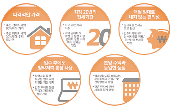 - 주로 중대형 임대주택(59m2, 85m2, 115m2)을 중산층 및 실수요 무주택자를 대상으로 임대료 납부방법을 보증부 월세가 아닌 장기간 전세로 임대하는 주택임대형태이다.