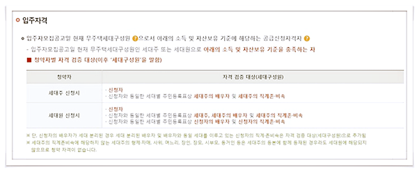- 청약자격은 청약통장을 보유한 무주택 세대 구성원으로 매년 소득기준과 자산기준이 변경됨.