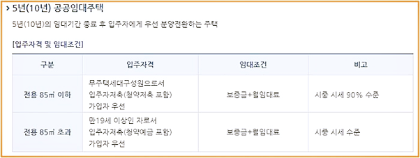 ▣ 공공임대는 5년, 10년의 기간동안 거주후 입주자에게 우선적으로 시세에 따라 분양전환이 가능한 임대아파트로 LH에서 주로 공급하며, 5년임대, 10년임대, 분납임대의 3종류가 있다.