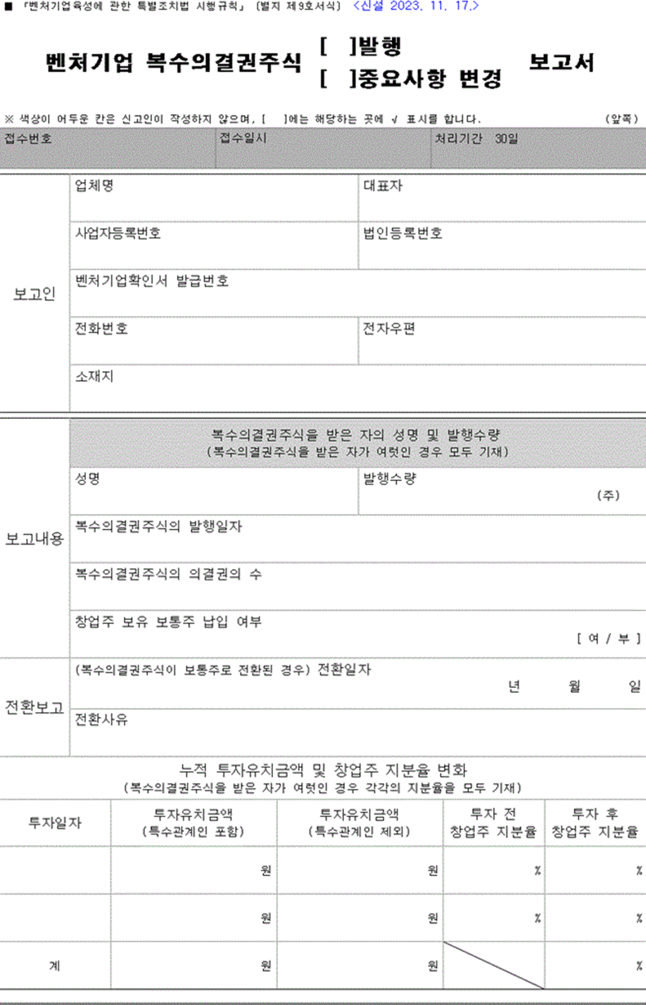 제4조의6(복수의결권주식의 보고) 영 제11조의10제3항 각 호 외의 부분에서 “중소벤처기업부령으로 정하는 보고서”란 별지 제9호서식을 말한다. [본조신설 2023. 11. 17.]