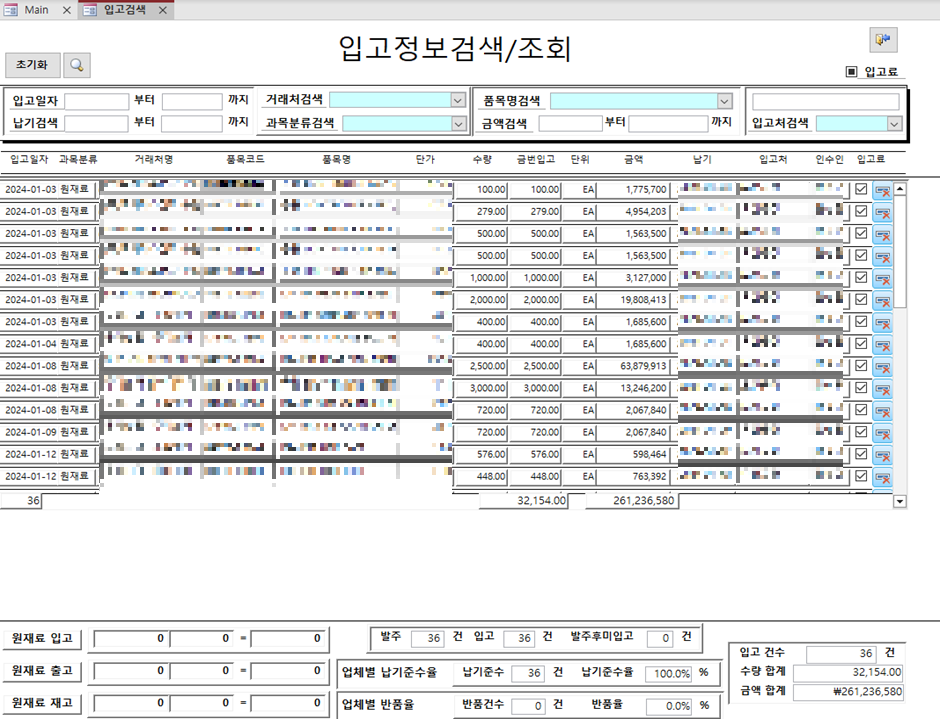 상기 입고등록 폼을 통해 원재료의 입고를 처리하는 방식도 발주정보의 처리와 마찬가지로 하나의 품목/하나의 발주 건에 대해서만 처리가 가능하므로 대량의 원재료 입고 처리를 원한다면 입고조회 테이블을 열어 수동으로 데이터를 처리할 수 있다.