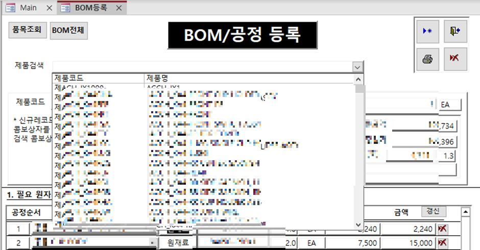 등록된 제품에 대한 BOM/공정 조회는 상단 제품 검색 콤보상자를 이용하도록 한다.