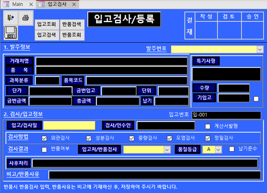 입고등록 폼의 발주정보 콤보상자를 클릭하면 발주후 입고가 되지 않은 항목들이 나타나고 입고된 원재료 항목을 선택하여 입고등록 처리를 진행한다. 이 때 언재료의 외관검사, 성분검사, 중량검사, 오염검사, 정밀검사 등의 검사항목들을 수행하여 입고처리하도록 하며, 입고처 콤보박스를 클릭하여 오산공장, 평택공장 등 입고된 장소를 선택하여 등록하도록 한다.