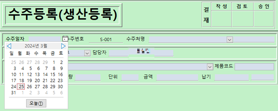 수주정보의 등록은 먼저 수주일자 필드에서 날짜를 입력하는 것으로 시작한다.