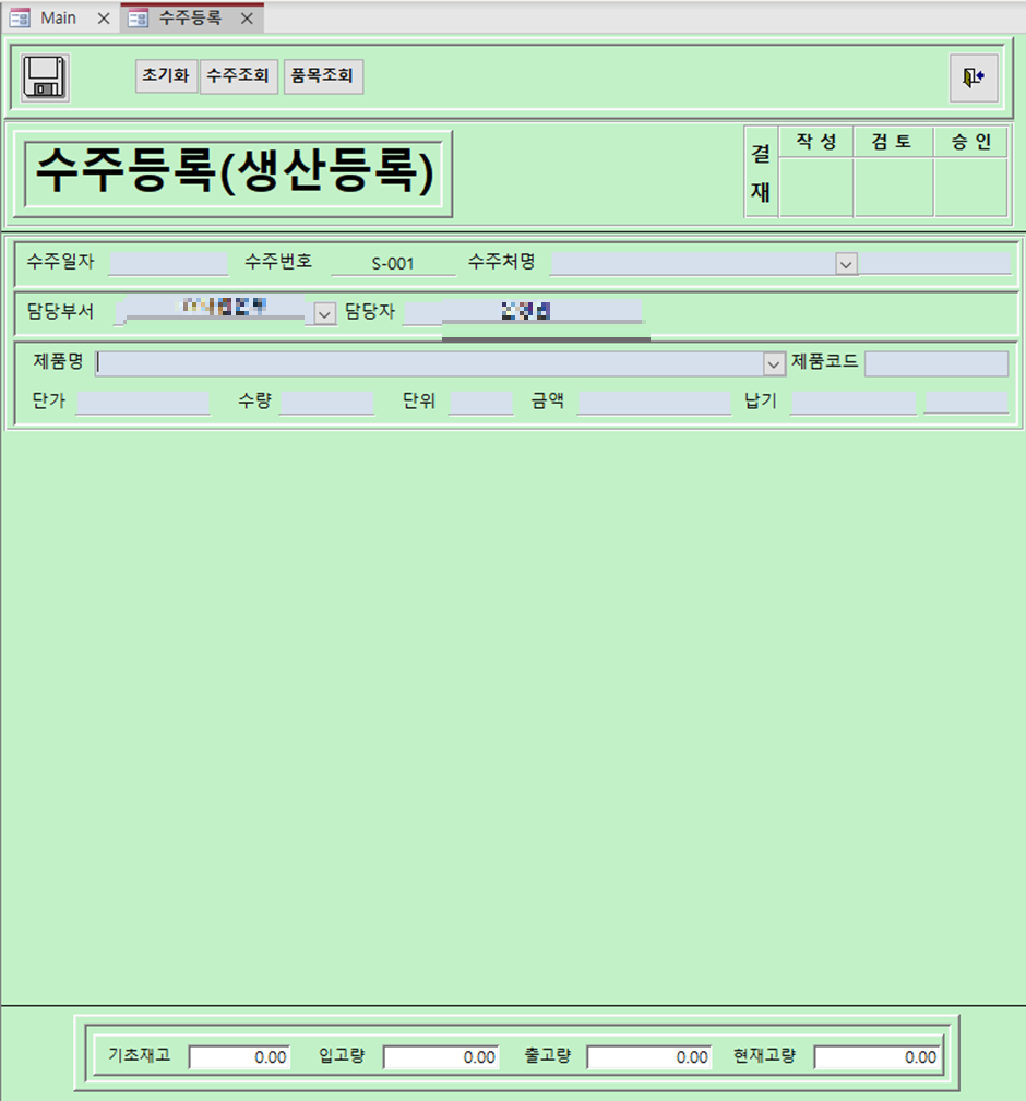 상단 수주조회나 메인폼의 수주조회 버튼을 클릭하면 입력된 수주데이타를 확인할 수 있다.