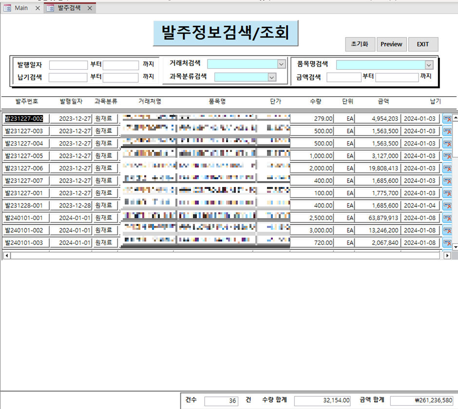 입력된 발주정보들을 종합적으로 볼 수 있고, 조건별로 검색할 수 있는 화면이 발주검색 폼이다.