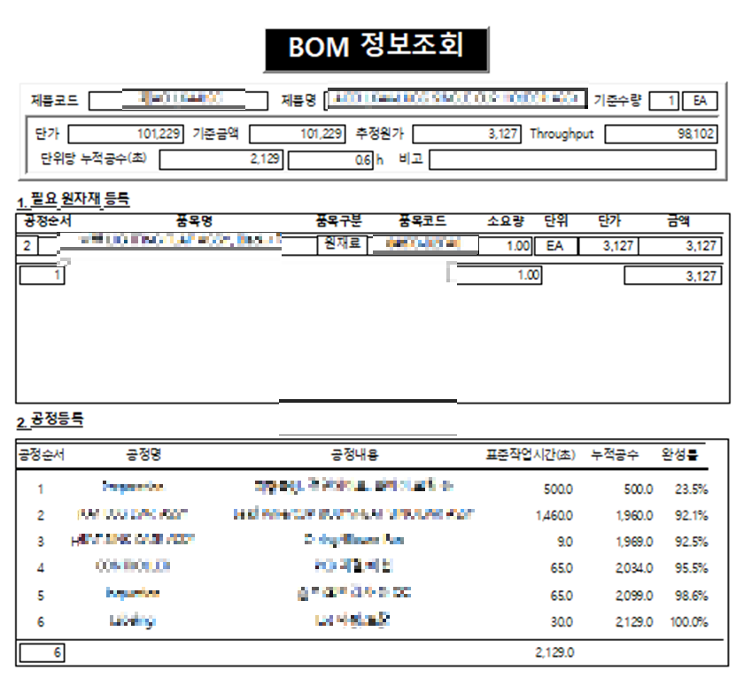 맨 우측의 인쇄 단추를 누르게 되면, 해당 제품의 BOM과 공정정보를 보고서 형태로 조회할 수 있다.