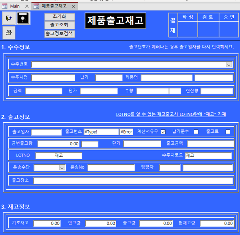 가끔 출고일자를 입력했는데도 출고번호가 에러가 나는 경우가 있는데, 이 때에는 커서를 출고일자와 출고번호가 아닌 다른 텍스트박스로 옮겼다가 출고일자를 지우고 다시 출고일자를 입력하면 해결될 것이다.