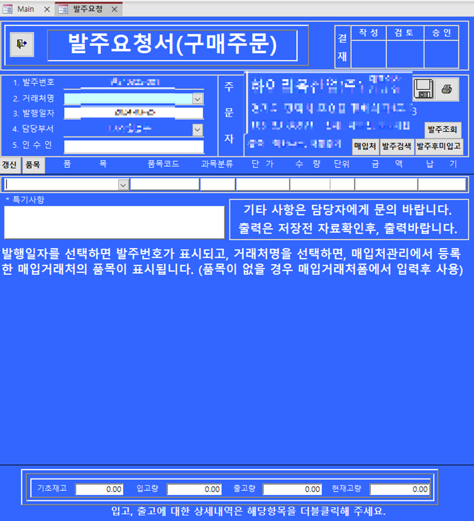 데이터를 입력한 후 우측 상단 주문자 정보의 저장버튼을 클릭하여 발주정보를 저장한다. 상기 폼의 단점은 하나의 원재료에 대한 발주만 입력되어 대량 발주정보를 등록하기 곤란한 점인데, 기타품목등록 테이블에서 설명한 방식대로 발주정보도 발주주문 테이블에 수동으로 대량의 발주주문 정보를 입력할 수도 있다. 이 때 발주번호에 대한 입력방식을 고려하여 처리하여야 한다.