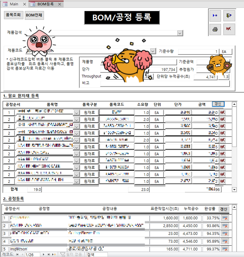 맨 우측 상단에 보면 새로운 레코드를 입력할 수 있는 단추가 나오는데, 이 단추를 클릭하면 새로운 제품의 BOM과 공정을 등록할 수 있다. 주의해야 하는 점은 폼의 좌측 제품코드 아래에 적혀있는 주의사항대로 신규 레코드 입력시 최초에만 제품코드 콤보상자를 이용하라는 점과 하단 필요원자재등록과 공정등록 폼이 모두 하위폼이기 때문에 상단의 제품코드부터 비고까지의 정보를 등록한 후에 데이터들을 입력하라는 점이다. 하위폼이 있는 경우에는 모두 메인 폼에서 데이타를 입력한 후에 하위폼의 데이터를 입력해야 오류 데이터가 발생하지 않는다.