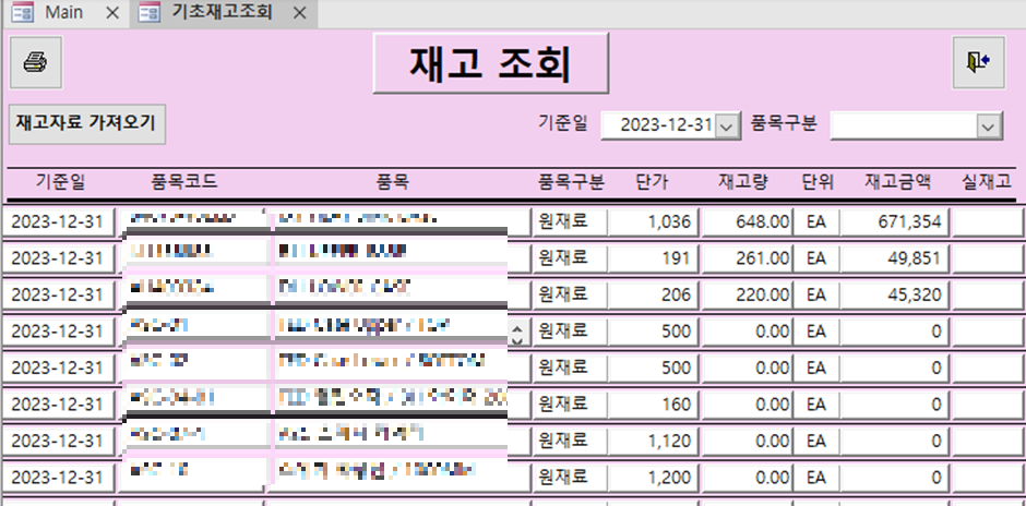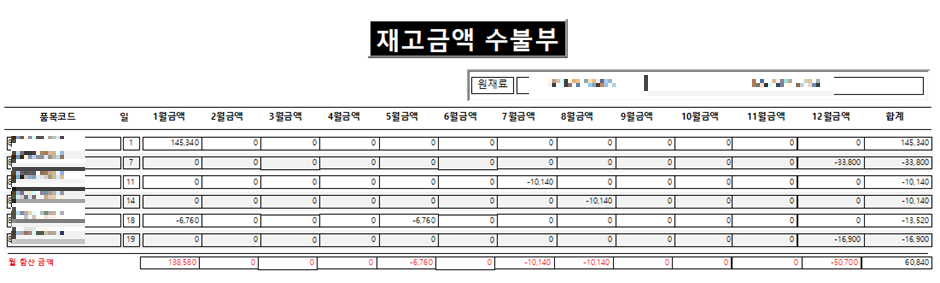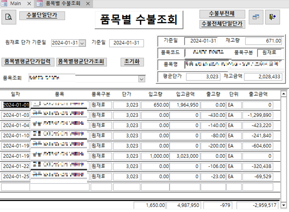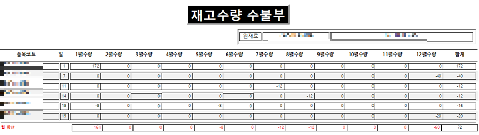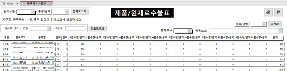 우측에 있는 품목구분과 품목조회 콤보박스는 개별 항목에 대한 수불부를 조회할 수 있는 기능을 가지고 있다.
