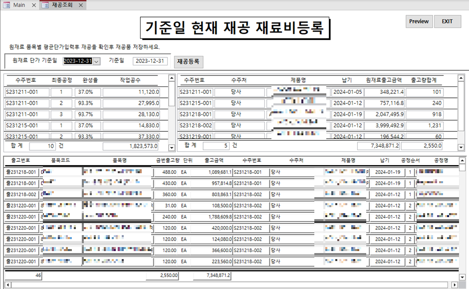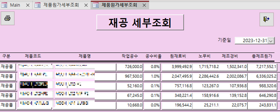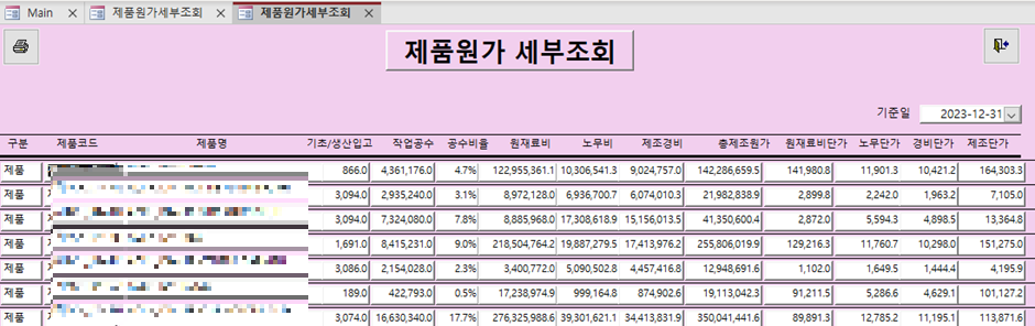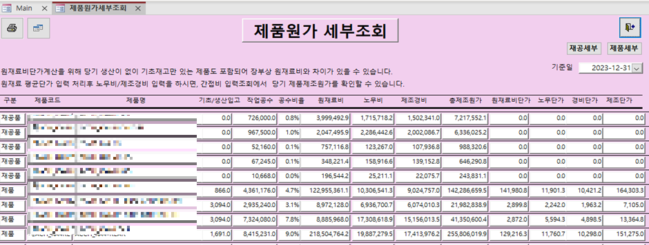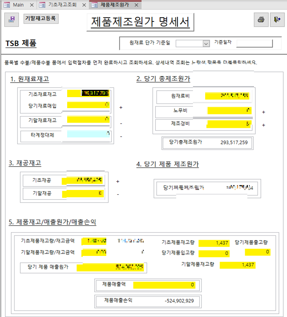 이렇게 입력된 정보는 메인폼에서 분기별조회 버튼을 클릭하고 기준일을 선택한 후에 제품제조원가 명세와 기말 재고정보를 확인할 수 있다. 메인 폼에서 전체제품제조원가 버튼을 클릭해서 조회하면 다른 제품군의 제조원가 명세서가 포함된 전체 제조원가 명세서를 확인할 수 있다.