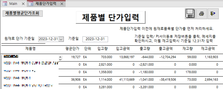 메인 폼에서 제품수불입력 버튼을 클릭하면 제품별 단가입력 폼이 나타나며, 원재료 평균단가 입력 폼과 마찬가지로 기준일을 입력하여 제품별 평균단가를 입력할 수 있다. 다만 원재료 평균단가 입력의 기준일은 기준일자에 구애받지 않았지만, 제품별 단가입력은 원재료 평균단가입력이 전제가 되어야 하므로 원재료 단가 기준일을 클릭하여 기준일을 동일하게 맞춰야 한다.