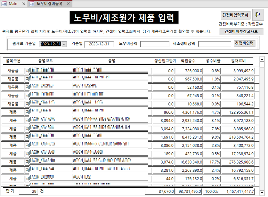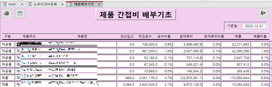노무비경비등록 폼에서는 기준일별로 노무비와 제조경비 총액을 입력하면 작업공수 비율에 기초한 배부기준에 따라 제품별로 간접비를 배부하도록 설계되어 있다.
