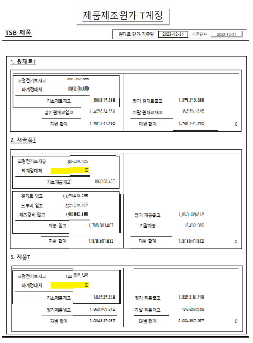 노란색으로 표시된 타계정대체와 관련한 데이터를 수기로 입력하면 T계정 양식에 의한 제조원가 정보를 확인할 수 있다. 우측에 표시된 0 은 차변과 대변의 차이로 적합성을 표시한다.