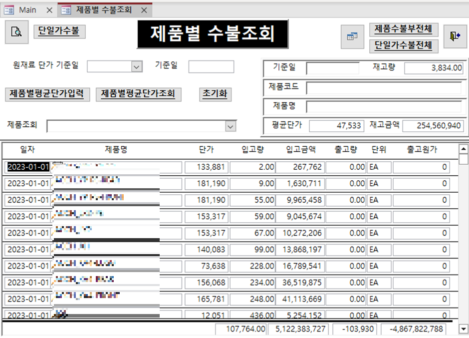 메인 폼에서 개별제품수불 버튼을 클릭하면 원재료 수불부와 마찬가지로 아래와 같은 폼을 볼 수 있다. 원재료 단가 기준일을 클릭하여 기준일을 설정해주면 원재료 수불부와 마찬가지로 개별 제품별 수불부를 확인할 수 있으며, 상단 단추별 기능은 원재료 수불부 폼에서와 다르지 아니하다.