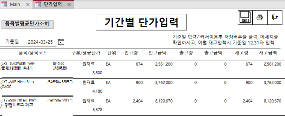 메인폼에서 품목별수불입력 버튼을 클릭하여 단가입력 폼을 연다.