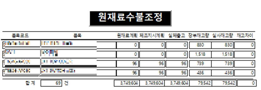 위에서 보여지는 보고서는 69건의 원재료 항목에 대한 원재료 계획, 제조지시서상의 원재료 소요 계획, 실제 출고량 정보 뿐만 아니라 현장에서 올라온 실제 재고량과 장부상 재고량을 비교하여 파악할 수 있다.