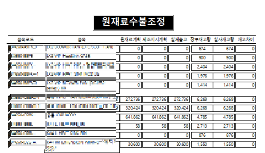 위 폼은 전체적인 원재료항목별 생산계획상의 원재료계획과 제조지시서상의 원재료 소요량 정보, 원재료 출고량 정보, 현재 장부상 재고량, 현장으로부터 받은 원재료 실제 재고량 등을 비교하여 차이가 나는 부분을 수정해야 하는 작업을 수행하는데 필요한 폼이다.