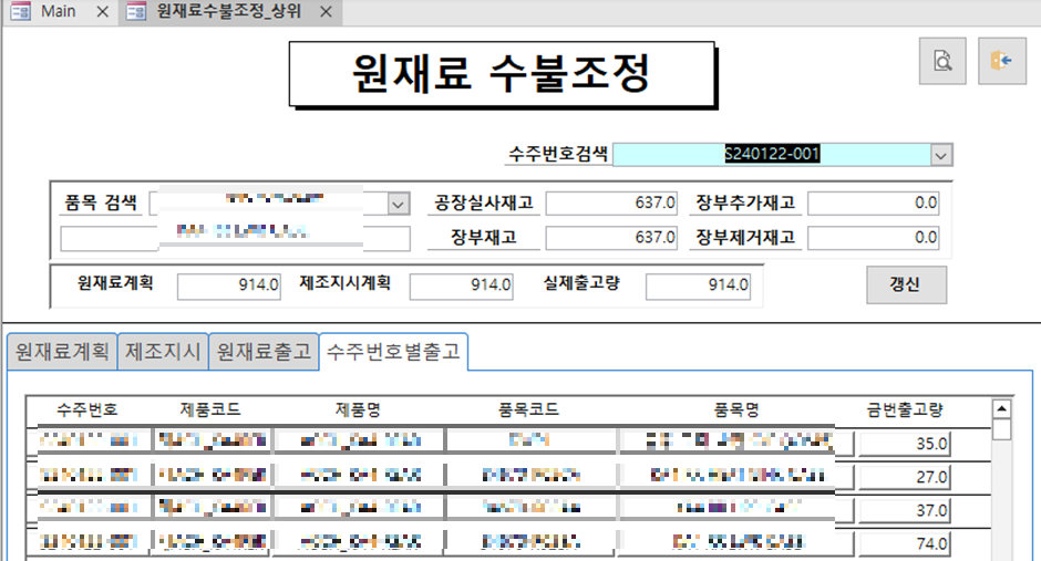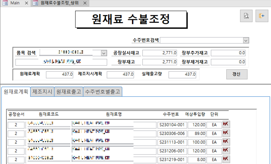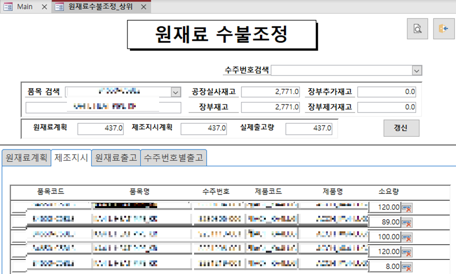 상기 원재료 수불 수량 조정과정에서 차이가 나는 항목들에 대한 조정이 필요할 경우 단순히 원재료 출고 항목만 수정하는 경우에는 생산계획 => 제조지시 => 원재료 출고 => LOT등록 => 제품 입고 등 제품생산과정에서 입력된 데이터들이 상호 오차가 발생하게 된다. 이를 수정하기 위해 별도의 폼을 통한 조정작업이 필요하다.
