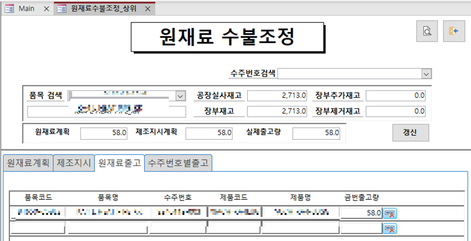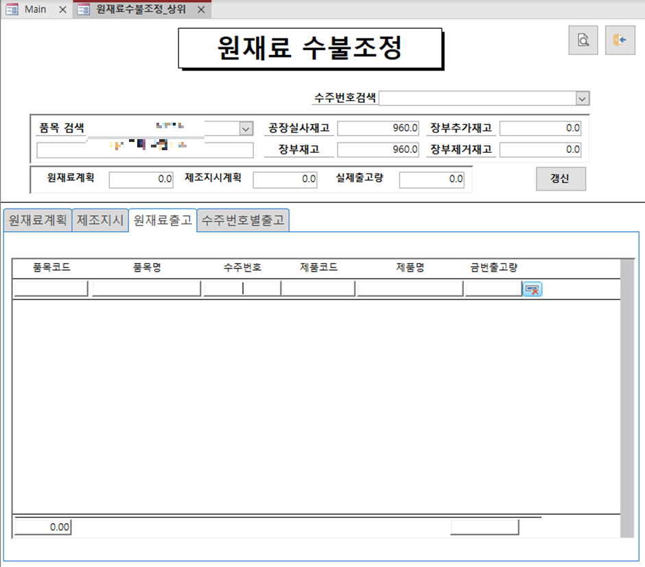 수정된 원재료 수량이 폼의 수치에 즉각적으로 반영이 되도록 하기 위해 갱신 버튼이 우측에 포함되어 있다. 이 갱신 버튼을 클릭하면 하위폼에서 수정된 수치가 상단 텍스트상자에 반영되어 표시된다.