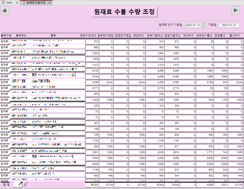 상기 2개의 로컬 테이블에 현장으로부터 받은 당기 원재료 매입자료와 기말 원재료 재고자료를 저장한 후, 메인 폼에서 원재료수불수량조정 버튼을 클릭하면 아래와 같은 폼을 볼 수 있다.