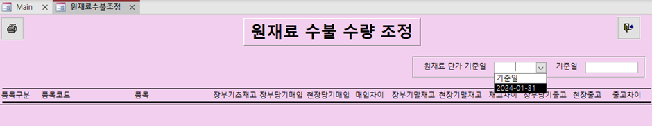 메인폼에서 원재료 평균단가를 입력하는 품목별수불조회 버튼 우측의 조정 버튼을 클릭하면 이를 수정하기 위한 폼을 열수가 있다.