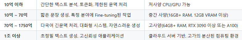 컴퓨터 사양과 사용 목적인 문서 분류, 텍스트 생성, 문장 요약 등 다양한 작업 환경에 따라 적정한 파라미터를 선택해야 한다.