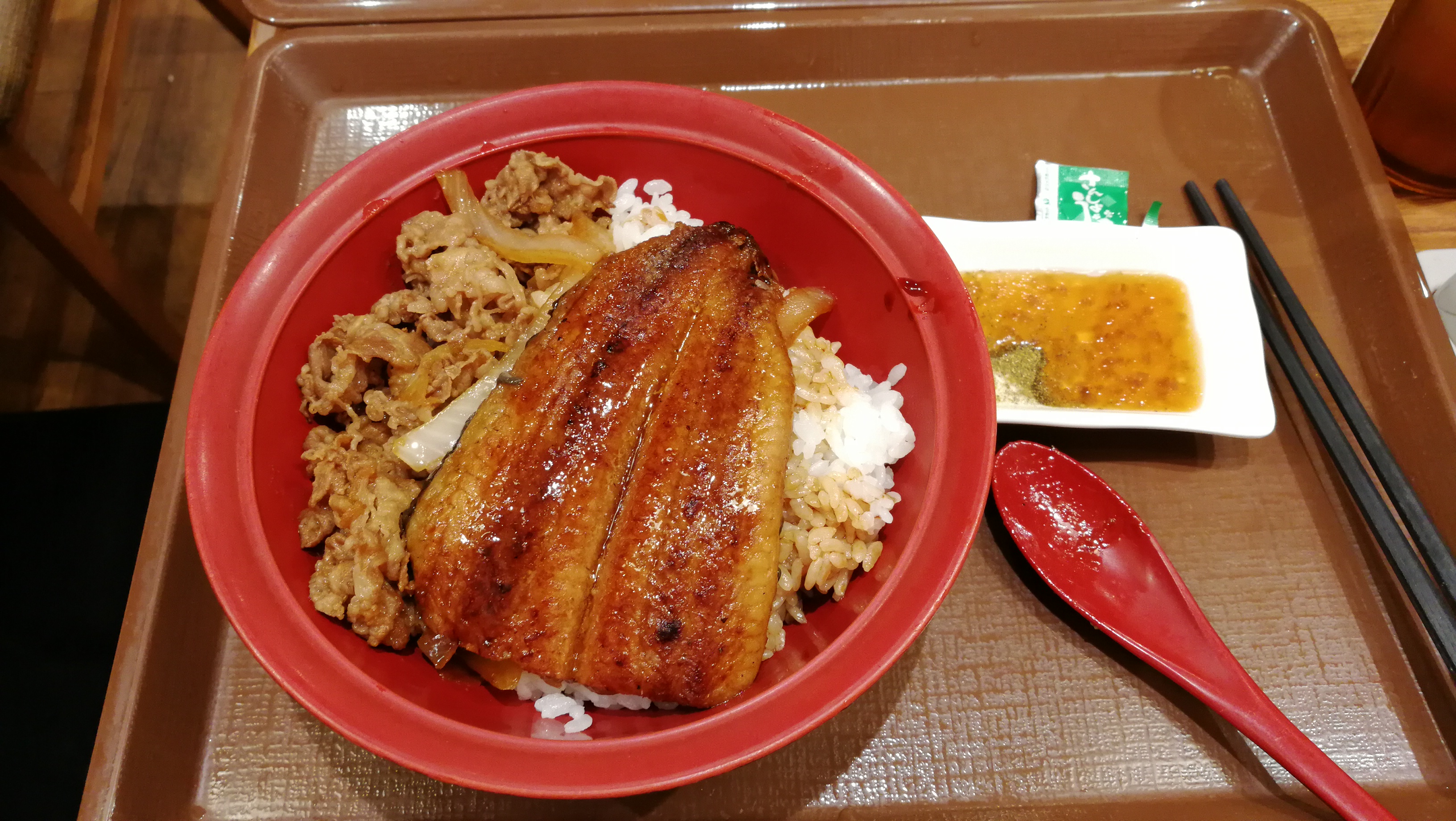 배가 고픈 관계로 장어덮밥을 시켜 먹었는데 우리돈 1만원도 안하는 가격에 맛도 그럭저럭 먹을만 했다. 장어 아래에 고기가 들어있는 덮밥이었다.