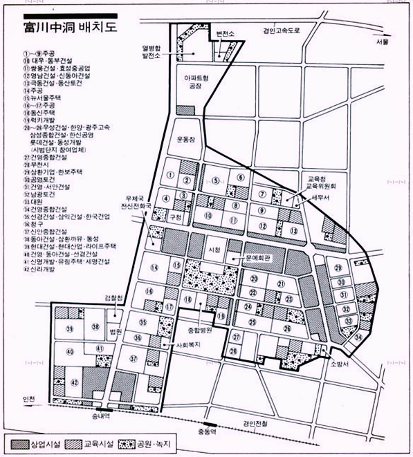▣ 부천 중동지구는 총 5,456천㎡으로서 지구를 삼분하여 토지공사, 부천시, 주택공사가 합동으로 사업에 참여하였으며, 서울 중심부로부터 남서쪽 20km 정도에 위치하여 북측으로는 경인고속도로가 지나가고, 남측으로는 경인전철과 접하는 등 서울 및 인천방향으로의 교통이 대단히 편리한곳으로서 개발가능성이 점쳐지고 있는 곳이었다.