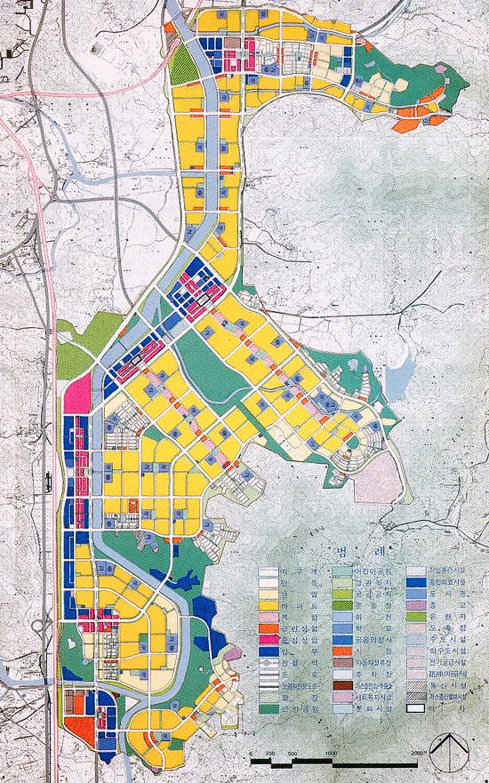 - 복합용도를 주거단지와 상업지의 주요활동축에 삽입함으로써 상업지와 주거지의 활동을 다양하게 하였고 주거지역을 고속도로 소음으로부터 보호하기 위하여 고속도로변에는 업무용지를 배치하고, 중심상업용지는 도시성장을 고려하여 탄천부근에 배치하였다.