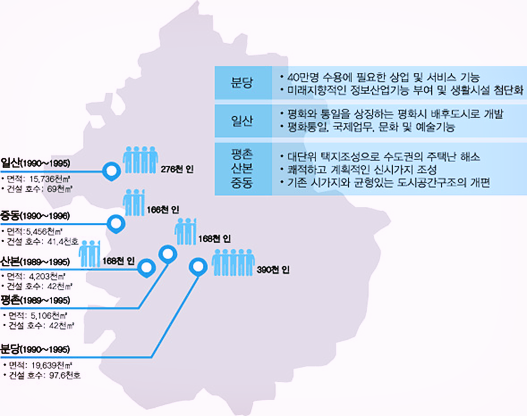 ▣ 노태우 정부의 200만호 주택건설계획으로 조성된 분당신도시(성남시), 일산신도시(고양시), 중동신도시(부천시), 평촌신도시(안양시), 산본신도시(군포시)의 이른바 5대 신도시가 상기와 같은 취지로 개발된 지역으로, 서울로의 집중을 막기 위해 신도시 건설후 서울 편입 요구를 억제하기 위해 서울시계에서 충분히 이격된 지역에 건설되었다는 특징도 있다.