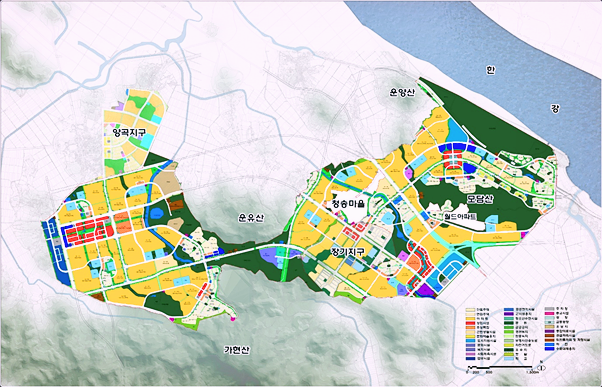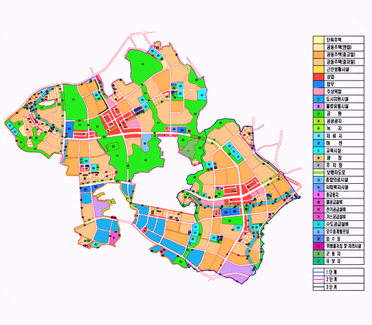 - 다핵분산형 도시구조로 전환하고, 고밀주거지는 주민의 이용도가 높은 상업용지나 역세권과 가까운 지역에 배치하고, 중ㆍ저밀 주거지는 고밀주거지의 배후지,평지 등에 배치할 계획이다.