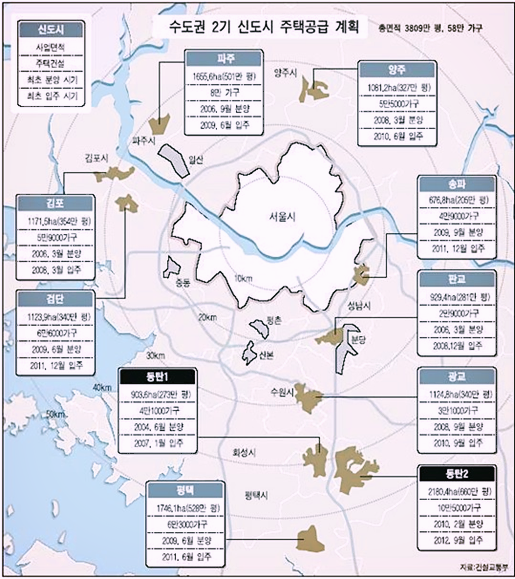▣ 성남 판교, 화성 동탄, 위례신도시는 서울 강남지역의 주택수요 대체와 기능을 분담하고, 김포 한강, 파주 운정, 인천 검단 신도시는 서울 강서 및 강북지역의 주택수요 대체와 성장거점기능을 분담하며, 광교신도시는 수도권 남부의 첨단 및 행정 기능을, 양주(옥정·화정) 및 평택 고덕국제화계획지구는 각각 경기북부 및 남부의 안정적 택지공급과 거점기능을 분담하게 될 것이다.