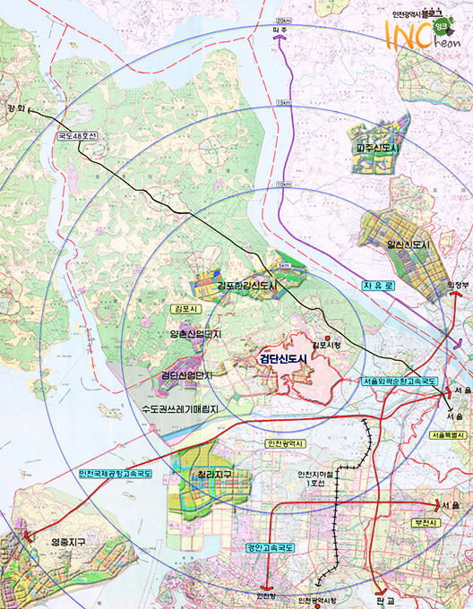 - 인천 검단신도시는 서울도심에서 20Km, 일산신도시에서 10km, 인천국제공항에서 20km지점에 위치하고 국도 48호선, 인천공항고속도로, 수도권 외곽순환도로와 인접하여 서울, 인천, 김포를 잇는 삼각축상의 중심에 위치한 광역교통의 요충지이며, 개발대상지는 영세공장들이 산발적으로 입지하고 주변에 토지구획정리사업 등 개발사업이 이루어지고 있다.