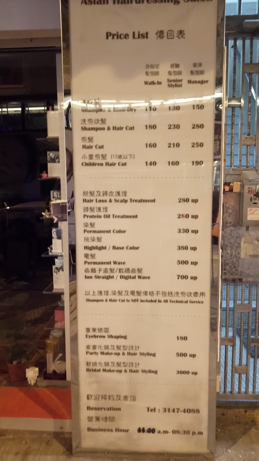 이곳저곳 기웃거리다가 길가에 표지판이 있어 찍어본 미장원의 가격표 모습이다. 다른 건 모르겠지만, Hair Cut 이라고 표시된 부분의 가격이 160-250 홍콩달러인 것 같은데, 우리나라 원화와의 환율이 150원정도이니 약 24,000원에서 38,000원 정도 하는 것 같았다. 2016년 12월 기준으로 이 가격이 비싼지, 싼지는 잘 모르겠지만,....