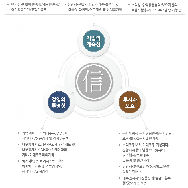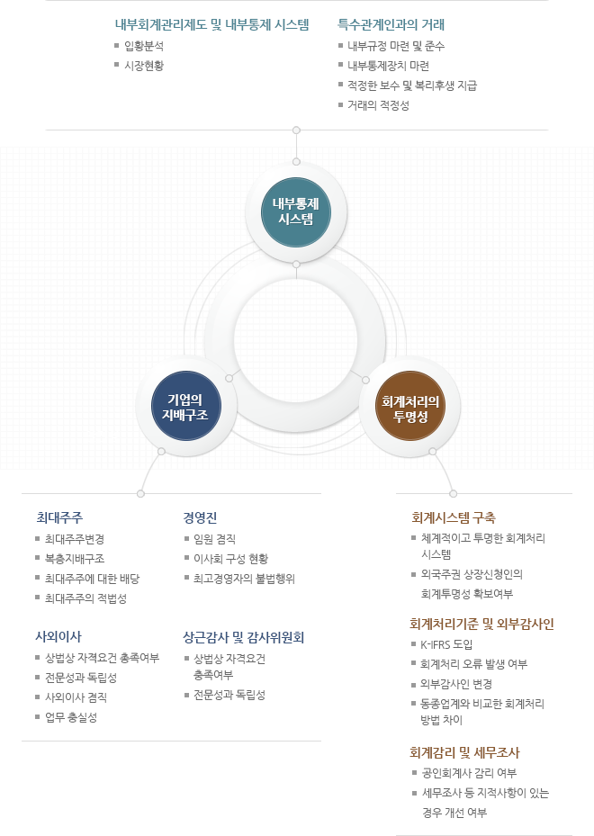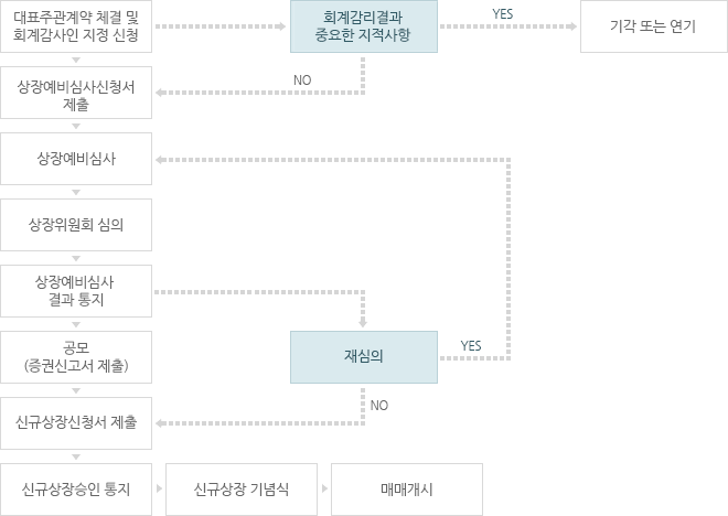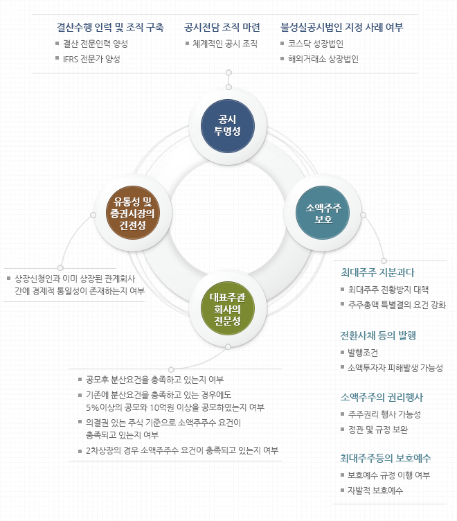 - 경영투명성 및 경영안정성 : 기업지배구조, 내부통제제도, 공시체제 및 이해관계자와의 거래, 상장전 주식거래 등에 비추어 경영투명성 및 경영안정성이 인정될 것