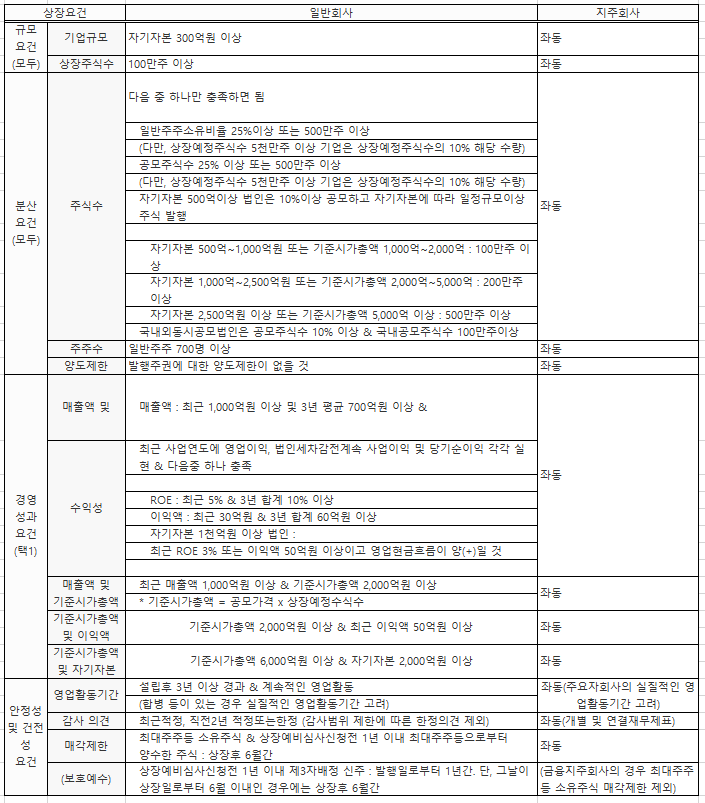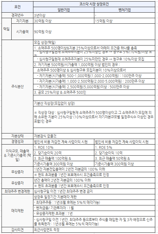 | 상장요건 | 일반기업 | 벤처기업 | 기술성장기업 |