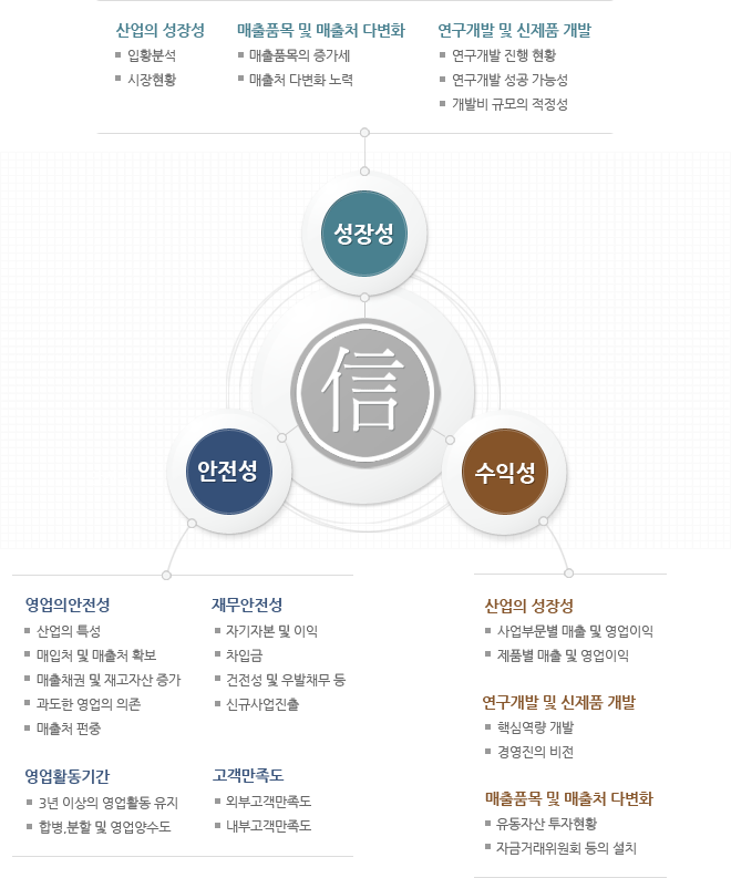 ㆍ벤처기업: ①기술성 ②시장성 ③수익성 ④경영성 ⑤재무상태