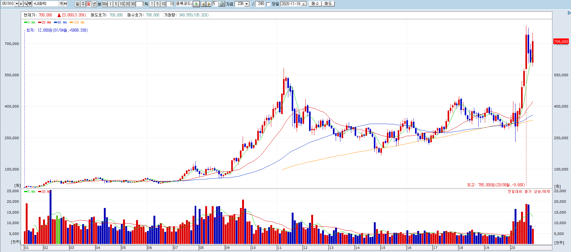 LG화학의 2001년부터의 월봉이다. LG화학은 2001년 4월 상장이래 12,000원에서 출발하였으나, 상장시점이 최저가였고, 현재 70만원대가 최고가인 몇 안되는 종목이다. 최저가 대비 최고가기준 약60배의 수익으로, 2000년대이후 최고 주식 가운데 하나이다.