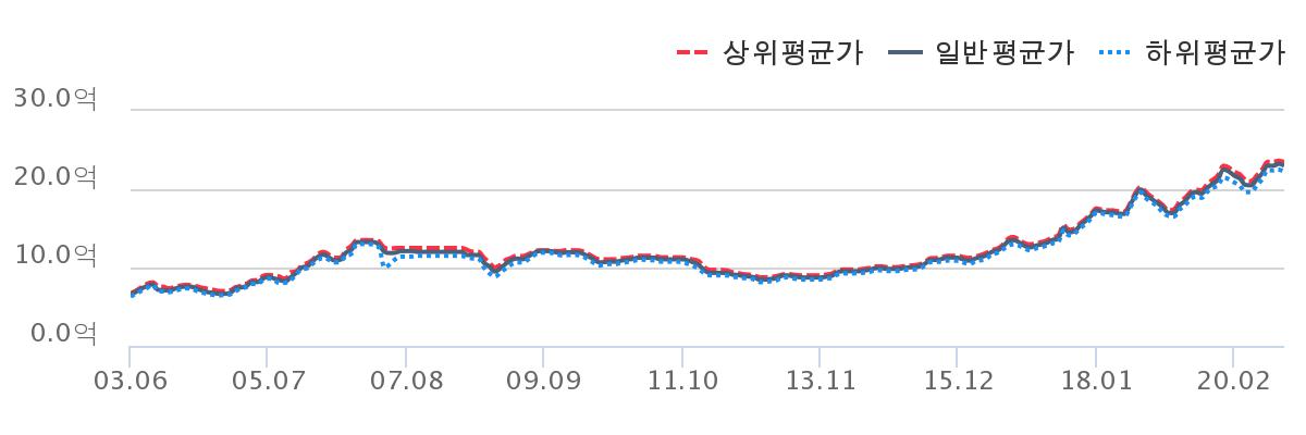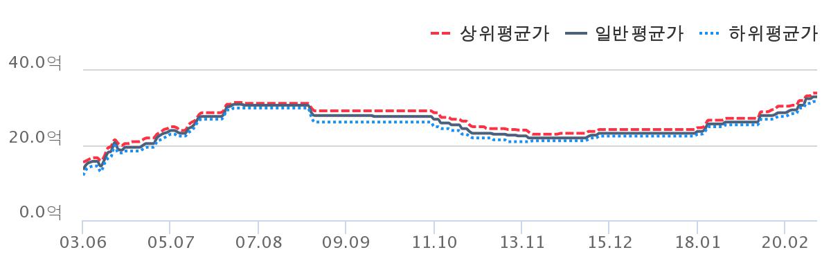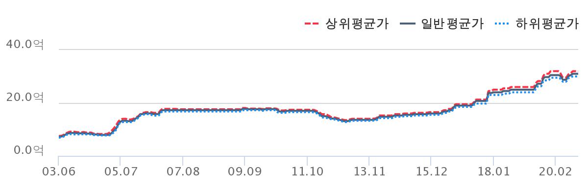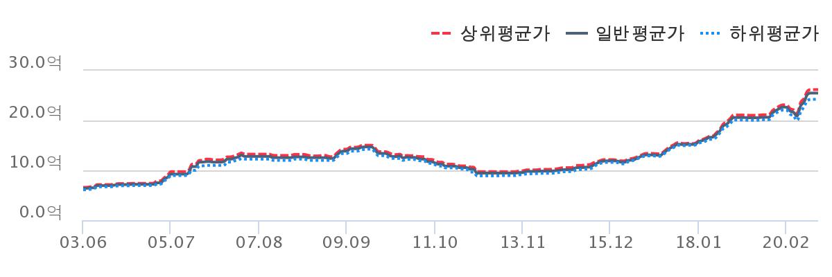2003년 6월 6.5억원에서 현재 23억원까지 시세가 상승하였다. 아파트시세는 주식차트와 달리 거의 대부분이 삼성전자 주식차트와 같이 현재가가 사상최고가이다. 따라서 최저가와 최고가 비교는 가장 먼 과거와 현재를 비교하면 된다. 2003년을 기준으로 하면 약 3.5배정도가 되지만, 입주당시 분양가가 2,094만원선이었음을 감안하면 1979년 입주이후 현재가로 비교하면 109배정도 가격이 상승하였다.