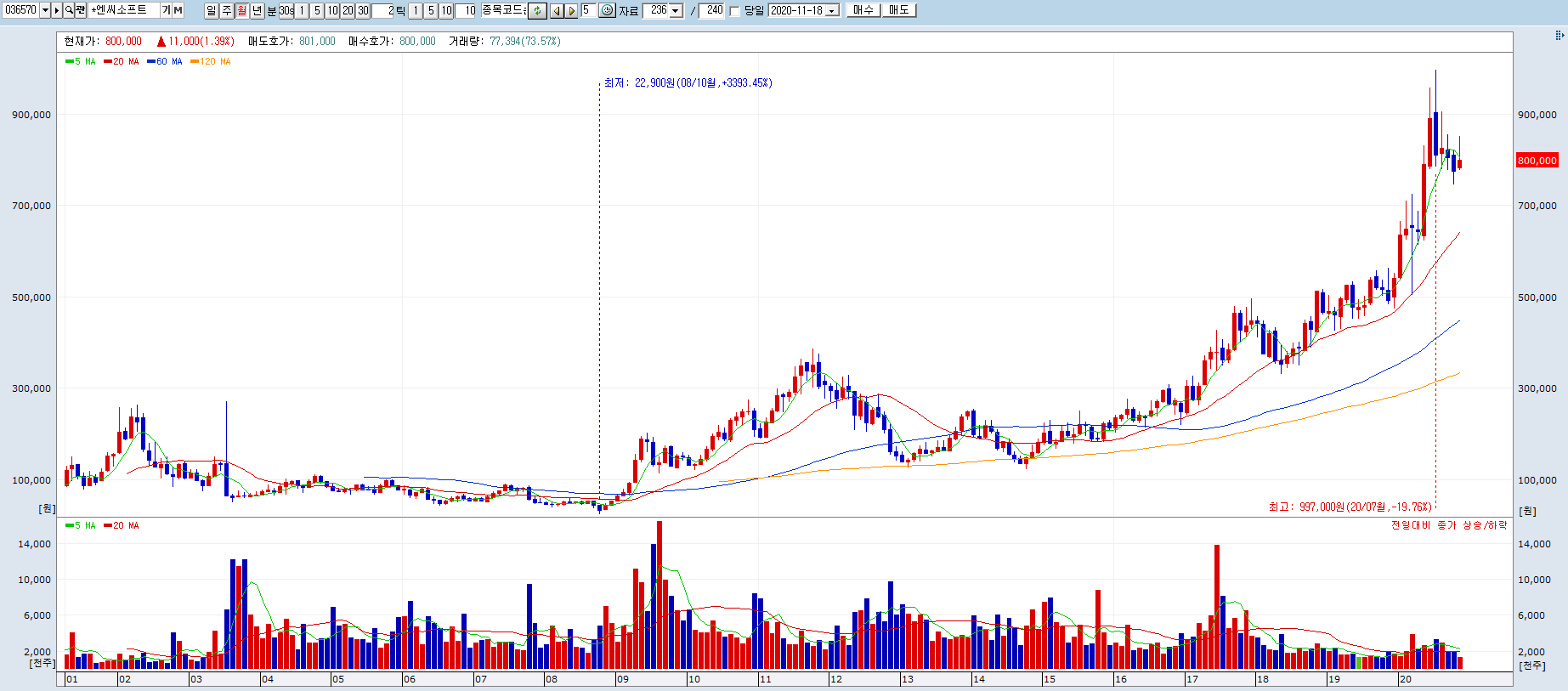 NC소프트의 2001년부터의 월봉이다. NC소프트는 2003년 5월 상장이래 경제위기 시기인 2008년 10월 22,800원으로 최저가를 찍었으나, 이후 반등하여 최근 거의 100만원근처에서 최고가를 기록한 후, 현재 80만원대에서 거래되고 있다. 최저가 대비 최고가기준 약44배의 수익으로, 2010년대 최고 주식 가운데 하나이다.