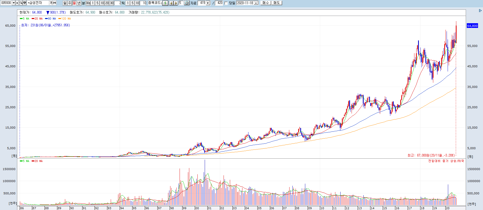1975년 6월 11일에 상장되어 1986년 1월 이후 231원을 최저점으로 하여 최근인 2020년 11월 최고점인 67,000원을 찍었다. 231원이 1986년이후 최저점인 이유는 그간 삼성전자의 액면분할과 무상증자 등으로 변화한 주가를 일관되게 수정한 것이다. 1986년 주가대비 현재까지 약 290배의 수익률을 올렸고, 현재 사상 최고가를 기록중이다. 이는 삼성전자를 상장시점부터 시작하여 매수했다가 손실보고 중간에 팔지 않았다면 아무도 손실을 본 사람이 없다는 의미이다. 결론적으로 가지고 있으면 이익을 보장했다는 의미이다.