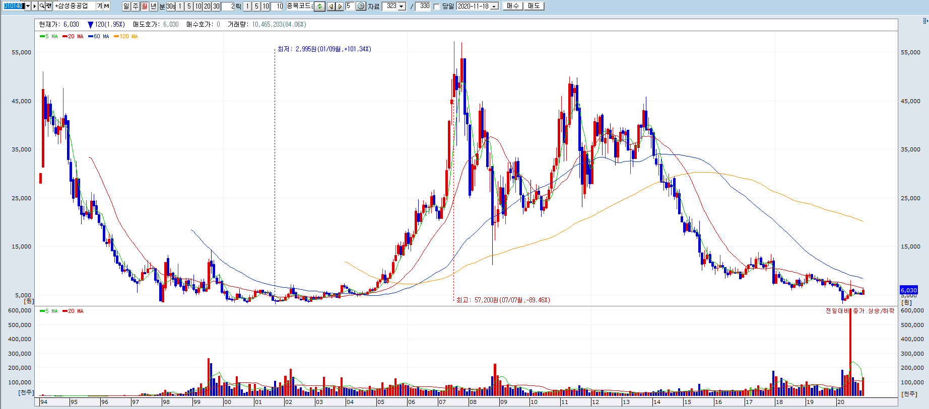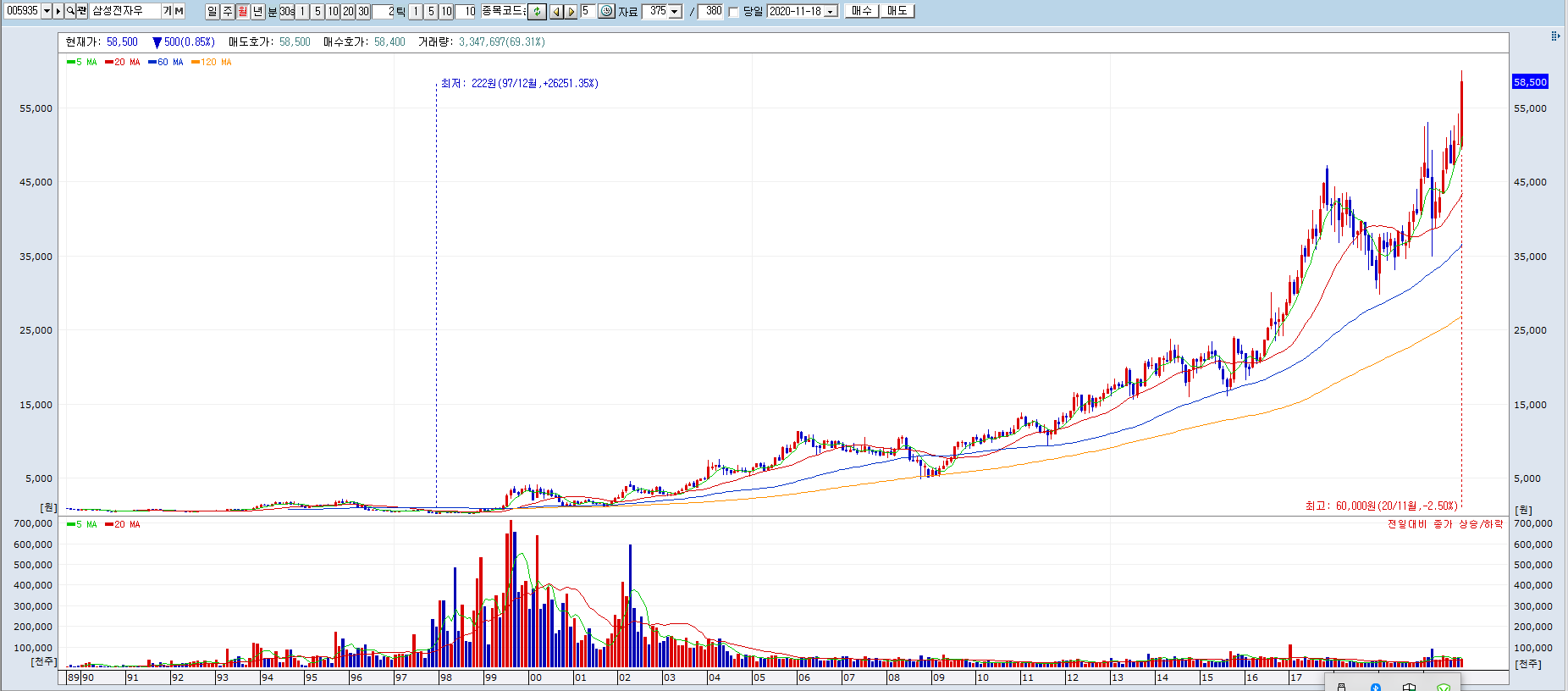 1990년초부터 현재까지 삼성전자 우선주의 월봉이다. 특이한 것은 1997년 IMF위기이전까지 1,000원정도에서 왔다갔다하던 주가가 1997년 12월 IMF위기때 사상최저가인 222원을 기록한 점이다. 그리고, 최근인 2020년 11월 60,000원으로 최고가를 갱신하고 있다. 최저가 대비로는 270배의 수익을 달성하였고, 이 종목도 보유시 손실을 보지 않는 종목이었음을 알 수 있다.