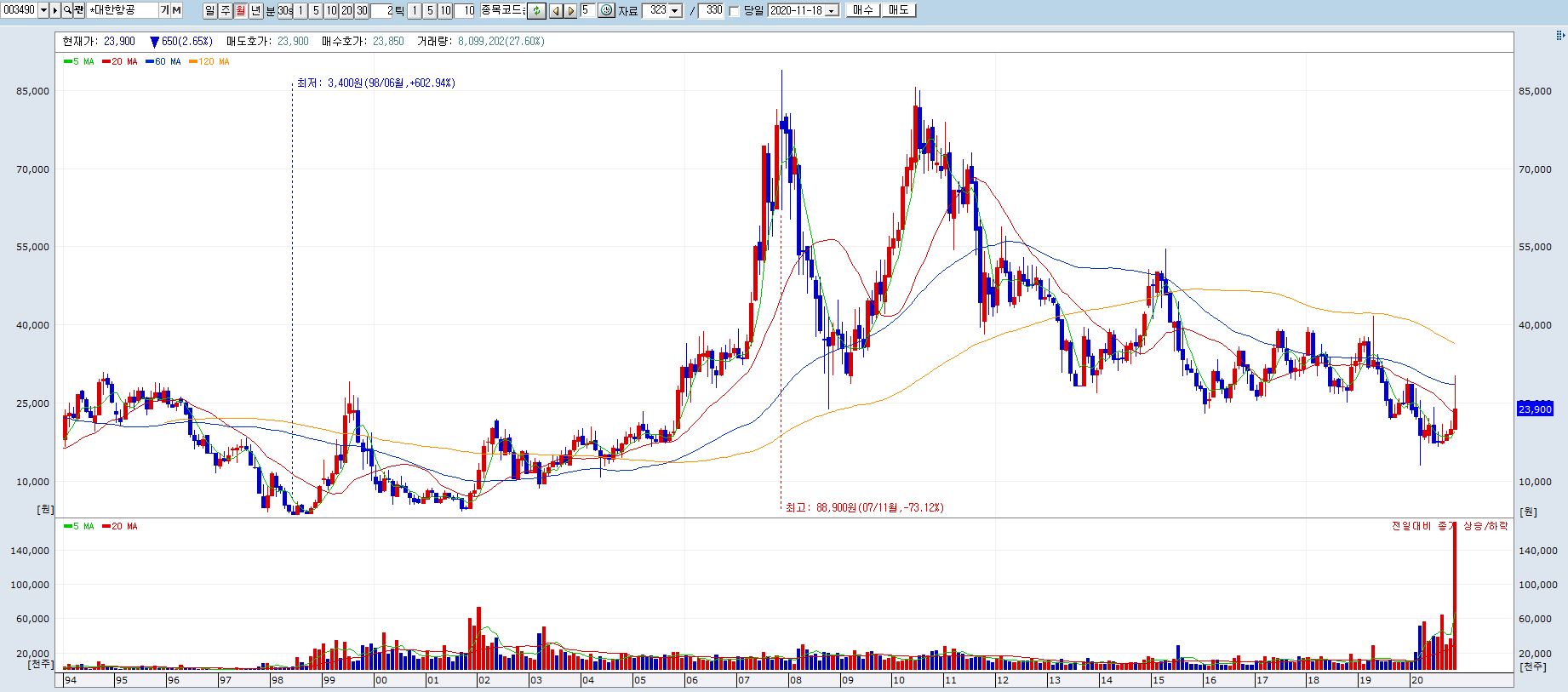 대한항공의 1994년부터의 월봉이다. 대한항공은 1966년 3월 상장이래 경제위기 시기인 1998년 6월 3,400원으로 최저가를 찍었으나, 이후 반등하여 2007년 11월 88,900원으로 최고가를 기록한 후, 재차 최고점 갱신을 노렸으나 실패후 현재 2만원대에서 거래되고 있다. 최저가 대비 최고가기준 약26배의 수익을 안겨줬으나, 2011년이후로는 보유시 손실 확률이 더 높았을 종목이다.