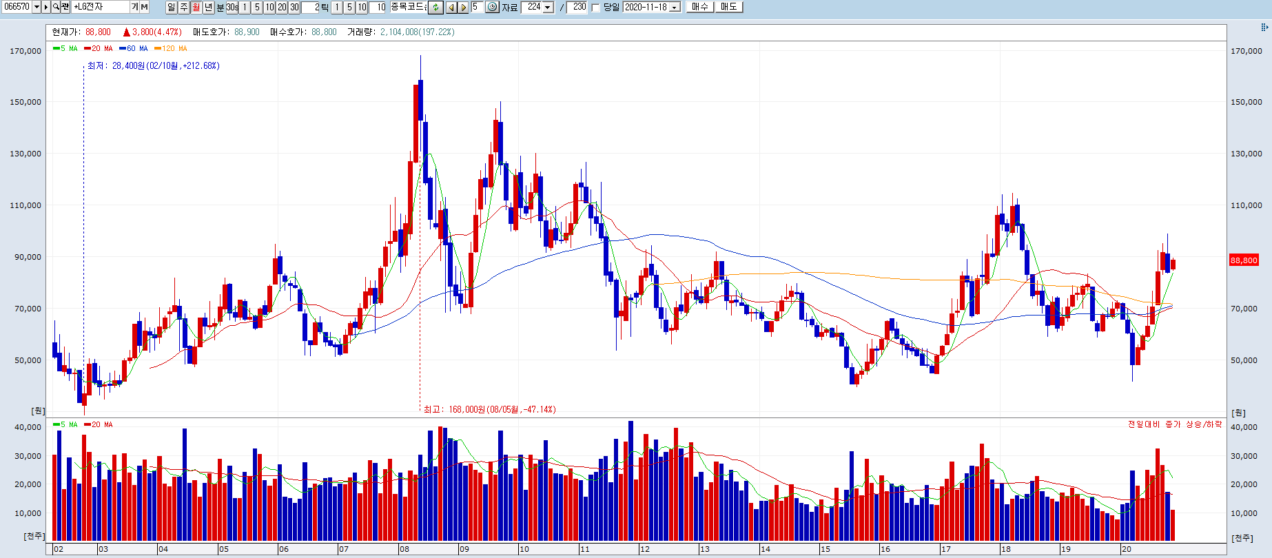 LG전자의 2002년부터의 월봉이다. LG전자는 2002년 4월 상장이래 28,400원에서 최저가를 기록한 후, 2008년 5월 168,000원에 최고가를 찍었다. 그 후 수차례 등락을 거듭하다 현재는 8-9만원선에 있다. 최저가 대비 최고가기준 약6배정도의 수익이 날 수 있었지만, 매매시점에 따라 손실도 많이 보았을 수도 있다.