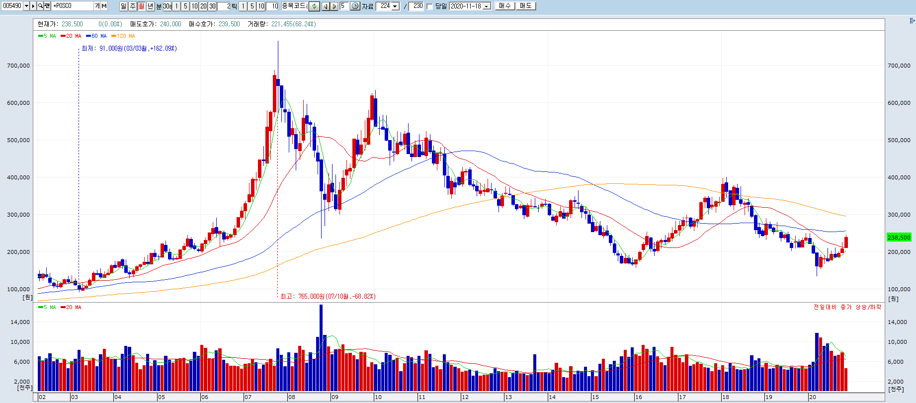 포스코의 2002년부터의 월봉이다. 포스코는 1988년 6월 상장이래 2003년까지 9만원에서 2007년 10월 765,000원에 최고가를 찍었다. 그 후 반등을 노리다가 현재는 23만원선에 있다. 최저가 대비 최고가기준 8배정도의 수익이 날 수 있었지만, 매매시점에 따라 손실도 많이 보았을 수도 있다.