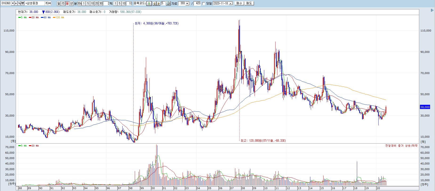 삼성증권의 1988년부터의 월봉이다. 삼성중공업은 1988년 3월 상장이래 IMF 경제위기시기인 1998년 6월 4,300원으로 최저가를 찍었다. 그후 증권업종의 경기에 영향을 받아 급등과 급락을 반복하다가 2007년 11월 120,000원으로 최고가를 기록한 후, 재차 최고점 갱신을 노렸으나 실패후 급락하여 현재 3만8천원대에서 거래되고 있다. 최저가 대비 최고가기준 약28배의 수익을 안겨줬으나, 급등락속에서 보유시 손실 확률이 더 높았을 종목이다.